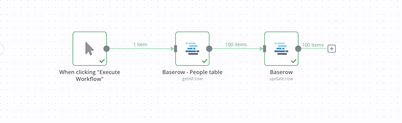 Next, search and add the Baserow node. Configure the Baserow node parameters to list rows in the People table. To list rows in the People table, a GET request has to be made to the People endpoint: